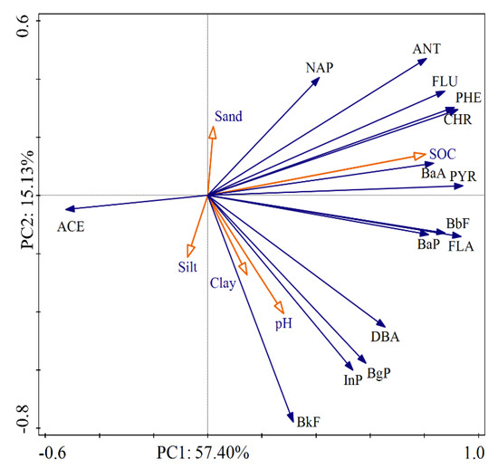 Commonly, soil properties such as pH, SOC, and texture, are important factors affecting the concentrations of PAHs [26]. In our study, the vector magnitude of environmental factors indicated that SOC was the most significant factor. The soils with high SOC had a strong adsorption ability to PAHs, which affected the distribution and migration of PAHs in the environment. Poor correlation existed between pH and PAHs, indicating that pH was a non-critical parameter affecting PAHs. For soil particle size distribution, we found that the influence of sand, silt, and clay on the distribution of PAHs was basically the same. The difference was that most individual PAHs showed positive correlations with soil clay, whereas negative correlations with soil sand, suggesting that PAHs were more likely to accumulate in fine soil particles. The reason is that small particles revealed stronger affinities of PAHs than larger particles due to the higher surface area of smaller particles.