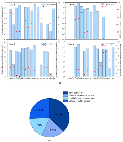 A major portion (37.57%) of the total measured PAHs was due to the factor 1, which was loaded predominately by NAP and ACE. Among all the different PAHs, NAP was the heaviest and was usually used as an indicator for the leakage of petroleum substances [28,29,30], whereas ACE was mainly from the combustion of petroleum-based fuel at lower temperatures. Earlier investigations have indicated that origins of LMWPAHs are petroleum products related to petrogenic sources [6,31,32]. Therefore, factor 1 was marked as related to petroleum sources. ANT, PHE, and FLU, which are believed to be the tracers of wood/grass burning, dominated factor 2, which accounted for 18.75% of the total PAHs [33,34,35,36,37]. Hence, factor 2 was identified as originating from burning of biomass. Factor 3 explained 17.80% of the total PAHs and heavily loaded on BaA, followed by ACE, ANT, PYR, NAP, InP, and BaP. Among them, BaA was not only the characteristic indicator of natural gas, but also the product of coal combustion [38,39]. Other PAHs were related to the release from burning of coal and coke combustion [40,41]. Thus, factor 3 was related to the combustion of coal/coke. Factor 4 explained 25.88% variance of the data and was high loaded predominately by molecular weight PAHs with a high loading on InP and BaP and moderately by BgP and DBA. InP and BgP were characteristic indicators of diesel and gasoline combustion, respectively [42]. Meanwhile, particulate matters of gasoline vehicle exhaust showed high emissions of InP and DBA [43,44]. Consequently, factor 4 was related to the source of vehicular traffic.