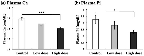 Figure 1a indicates the result of plasma Ca levels after intraperitoneal BaA injection. BaA (low dose: 1 ng/g of body weight) tended to decrease. The higher dose (10 ng/g of body weight) of BaA induced significant hypocalcemia.