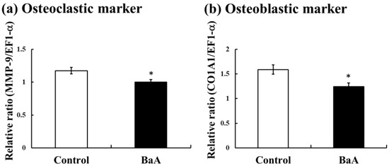 Osteoclastic marker (MMP9) mRNA expression results are shown in Figure 2a. BaA suppressed MMP9 mRNA expression. The mRNA expression of osteoblastic marker COL1A1 also decreased significantly (Figure 2b).