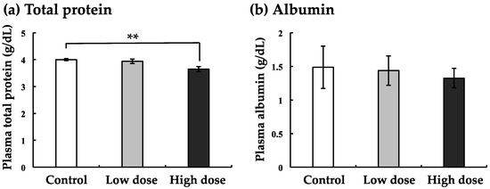 Effect of BaA on total protein (a) and albumin (b) in the plasma of BaA-treated or untreated nibbler fish. BaA (1 or 10 ng/g body weight) was injected intraperitoneally (four times) into nibbler fish for 10 days during breeding. Thereafter, total protein and albumin were examined in the control and experimental groups. ** indicates a statistically significant difference at p < 0.01 from the values in the control scales (n = 8). The detection limits of total protein and albumin were 1.0 and 1.0 g/dL, respectively.