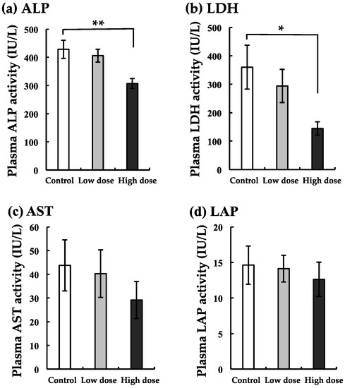 Changes in alkaline phosphatase (ALP) (a), lactate dehydrogenase (LDH) (b), aspartate transaminase (AST) (c), and leucine aminopeptidase (LAP) (d) of the liver with BaA treatment. BaA (1 or 10 ng/g body weight) was injected intraperitoneally (four times) into nibbler fish for 10 days during breeding. Thereafter, plasma liver markers were examined in the control and experimental groups. * and ** indicate statistically significant differences at p < 0.05 and p < 0.01, respectively, from the values in the control scales (n = 8). The detection limits of ALP, LDH, AST, and LAP were 2, 6, 3, and 0.4 IU/L, respectively.