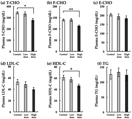Changes in total-cholesterol (T-CHO) (a), free-cholesterol (F-CHO) (b), ester type-cholesterol (E-CHO) (c), low-density lipoprotein cholesterol (LDL-C) (d), high-density lipoprotein cholesterol (HDL-C) (e), and triglyceride (TG) (f) with BaA treatment. BaA (1 or 10 ng/g body weight) was injected intraperitoneally (four times) into nibbler fish for 10 days during breeding. Thereafter, plasma lipid markers were examined in the control and experimental groups. * and ** indicate statistically significant differences at p < 0.05 and p < 0.01, respectively, from the values in the control scales (n = 8). The detection limits of T-CHO, F-CHO, LDL-C, HDL-C, and TG were 1, 1, 1, 2, and 2 mg/dL, respectively.