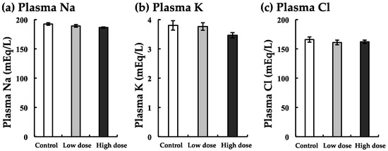 Plasma Na, K, and Cl levels were decreased slightly with both low and high doses of BaA (Figure 6). In these minerals, there was no significant difference between the experimental and control groups (Figure 6).