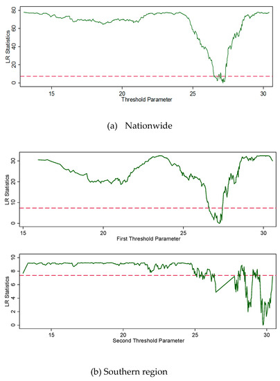 Table 3 shows that the estimated single threshold was 27.21 °C at national level. For the double threshold effects of temperature in the Southern region, the estimated values were 27.27 and 30.17 °C. The likelihood ratio (LR) statistics are plotted in Figure 1 to display the confidence interval construction for the nationwide model (a) and the southern region model (b).