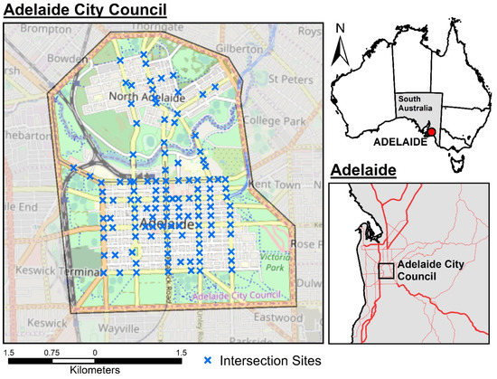 The study is constrained to the Adelaide City Council (ACC) area in South Australia, Australia—chosen based on the extent of the hourly intersection traffic volumes dataset. Figure 1 shows the location relative to wider Adelaide and Australia as a whole.