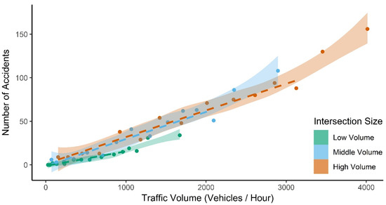Relationship between traffic volume (median of each congestion level) and accident frequency. The dashed lines are linear regressions. For low-volume intersections, the linear regression is only fit for the median traffic volumes of the first 12 congestion levels. For middle- and high-volume intersections, the linear regression is fit for median volumes of the first 13 congestion levels. 95% confidence intervals relate to loess regressions fit to the same data.