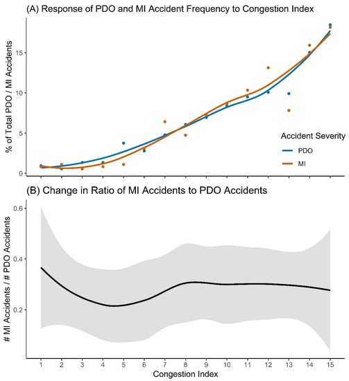 Effect of congestion on property damage only (PDO) and minor injury (MI) accidents: (A) Response of PDO and MI accident frequencies to congestion index. The y-axis shows normalised accident counts. The curves are loess regressions; (B) Change in the ratio of MI and PDO accidents with increasing congestion index level. Confidence band is 95%.