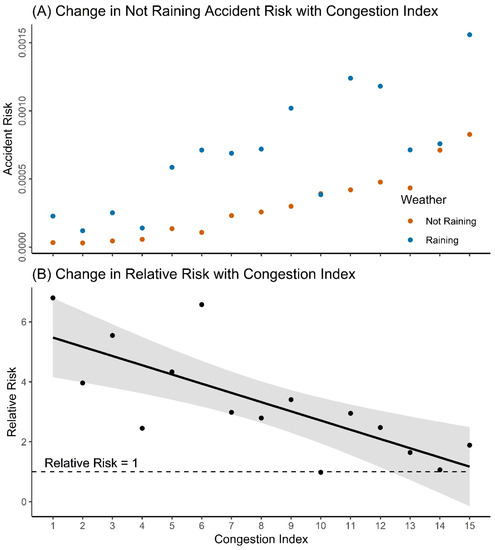 Accident risk is the probability that an accident will occur in any particular hour. Looking at congestion level 15 in Figure 5A, for example, the risk of approximately 0.0008 for not-raining accidents means that, while it is not raining, there is a 0.08% chance of an accident occurring at an intersection in the ACC in this congestion level. For both not-raining and raining accidents, the risk of an accident occurring increases with increasing congestion (Figure 5A).