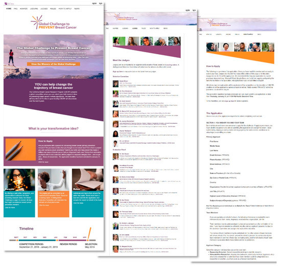 New to CBCRP’s third round of Program Initiatives was the idea that one source of research ideas could be a crowdsourced idea-generating competition or “grand challenge”. Challenges and incentive or inducement prizes are powerful tools for solving otherwise intractable problems and effecting change [19,20,21,22]. They are an approach that has been adopted by many philanthropies and governments, especially within the last decade. During the Obama administration, the U.S. federal government greatly expanded its use of challenges, including the creation of Challenge.gov [23]. One can tailor the design of a competition and amount of the prize to achieve a range of outcomes. Examples range from the National Eye Institute’s Audacious Goals challenge [24], which offered several USD 3000 prizes for ideas on new goals for the institute’s work on vision research—to the Ansari X Prize [25]—which offered one USD 10 million prize for the development and demonstration of a “reliable, reusable, privately financed, manned spaceship”. The Global Challenge to Prevent Breast Cancer was an example of an ideation challenge, a competition tailored to generate new ideas.