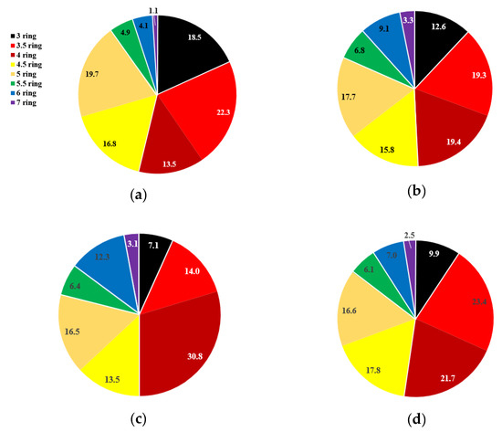 Percent of different ringed PAHs for each season: (a) Winter, (b) Spring, (c) Summer, and (d) Fall.