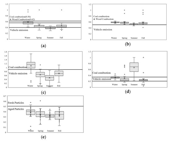 Particle aging was evaluated with the remaining ratio BaP/BaP+BeP [40], shown in Figure 3e. The higher intensity of the photochemical reactions in summer shows well the aged characteristics of the sampled PM. However, particle aging can also be observed in other seasons, including winter, a season that provides the least factors for atmospheric reactions, implying the possibility for PAH transport from outside of Seoul (Figure 3).