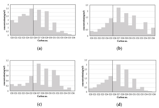 Shorter chained n-alkanes (C 25) are a known source of fossil fuel combustion. Plant wax emissions contribute to longer chained n-alkanes (C 25) with odd number carbons [28,41,42,43,44,45]. Figure 4a–d shows figures of averaged seasonal concentrations of n-alkanes. In order to compare the distribution of n-alkane concentrations by carbon number, the scale of the y axis for each figure was applied differently. The ratio of carbon chains shorter than C25 was higher in the winter compared to the other seasons, while the odd chained carbons longer than C25 gain importance from winter to summer (Figure 4).