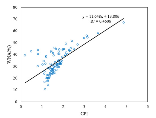 Figure 5 shows the correlation between CPI value and WNA. The correlation value was calculated as R = 0.69, a moderate correlation (0.5 < R < 0.7), meaning CPI and WNA are a good index for source contribution evaluation [46,47,48,49]. In Table 7, the calculated seasonal average CPI values range from 1.43 to 1.97. From winter to fall, CPI is closest to 1 in the winter and spring and increases onwards. WNA increases up to the summer season, then drops in fall. In addition, C27, C29, and C31 n-alkanes peak in all seasons. All of the information suggests that the entire sampling period was affected by plant wax sources, which was more significant in the warmer seasons such as summer, and the anthropogenic combustion sources dominated n-alkane production, especially in the winter compared to the other sampling periods (Figure 5) (Table 7).