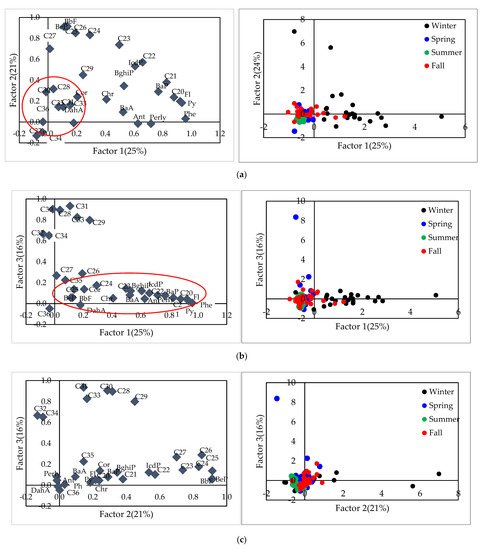 Figure 7 shows both the loading and score plot of PCA analysis for three factors. Winter and other seasons’(spring, summer, fall) samples were well separated (Figure 7a,b) which indicates different emission sources. The lower right part of the score plot is dominated by winter samples, which is characterized by LMW-PAHs, HMW-PAHs and lower chained n-alkanes in the loading plot (Figure 7b). Therefore a mixture of solid fuel combustion and vehicle emission is a major influence on winter atmosphere. Fall samples mostly overlapped with spring and summer samples in the lower left corner of the score plot, which implies the samples of these seasons has similar emission source. The overlapped area of the three seasons all included HMW-PAHs (DahA, Cor) and longer chained (C>25) in the loading plot. Thus we can expect that spring, summer and fall were mainly influenced by biogenic emissions and vehicular emission
