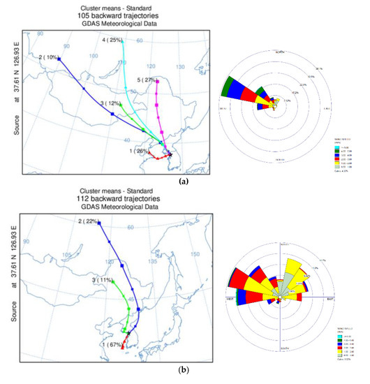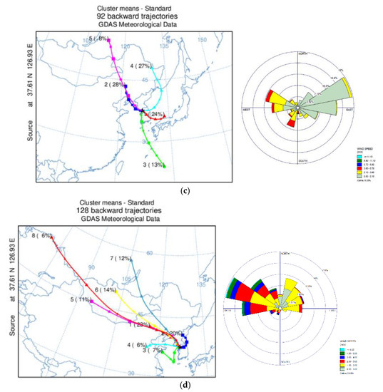 Figure 8a–d shows the seasonal cluster of three day back trajectory performed with HYSLPLIT, and averaged wind speed and direction calculated with WINDROSE. Since wind information at the PM2.5 sampling site was not measured, data from a meteorological station in Seoul (Station ID: 108, 37°34′ N, 126°57′ E) was utilized.