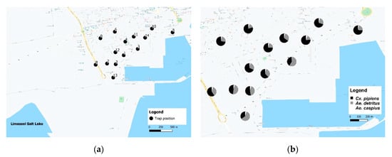 Mosquito trapping sites (a) and species composition at each site (b).