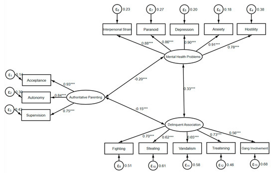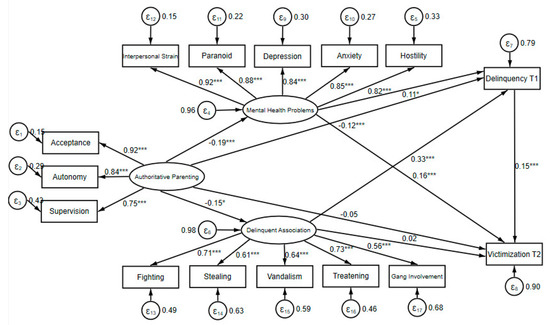 Structural part of the SEM provided further insights about the mechanisms through which authoritative parenting was related to delinquency and victimization. Authoritative parenting was negatively related to delinquency. However, the direct effect of authoritative parenting on victimization was not significant, suggesting that the influence of authoritative parenting on victimization may be completely mediated by other variables. Authoritative parenting was significantly related to mental health problems and delinquency peer association. Mental health problems were positively related to delinquency and victimization. In a similar vein, delinquent peer association was also found to be significantly related to delinquency and victimization. Finally, delinquency was also found to be significantly related to victimization.
