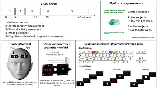Although the studies in the functional near-infrared spectroscopy (fNIRS) field are growing exponentially [,,], most of the studies that address the relationship between PA and cerebral oxygenation have the goal of measuring these factors in older adults to prevent or reduce cognitive impairment [,]. Little is known about the relationship between the participation in regular PA and cerebral oxygenation, more specifically prefrontal cortex (PFC) during cognitive processing in young adults, probably because the cerebrovascular reserve is not considered a limiting factor in this period of life []. Nevertheless, it is well established that the cardiovascular fitness of children and adolescents, and consequently of young adults, has been steadily decreasing for several decades, probably due to a significant decrease in weekly physical activity [,,]. The potential consequences to cerebrovascular reserve are obvious (e.g., stroke, transient ischemic attack, cognitive issues, etc.), and suggest that the research effort on the link between PA and executive performance should not be limited to the elderly, but be concerned with all ages of life. The possibility of specific age-related effects of PA on executive performance should be explored. In all cases, mechanisms affecting cognitive performance in young adults should be studied in order to make appropriate recommendations. Therefore, the purpose of this study was to assess whether executive function and prefrontal oxygenation were dependent on physical activity level (active versus inactive) in healthy young males. We hypothesized that (1) executive performance would be better in participants with a higher level of PA compared to lower and that (2) in comparison to participants with a lower PA level, changes in PFC cerebral oxygenation would be greater in those with higher PA level in executive function conditions.