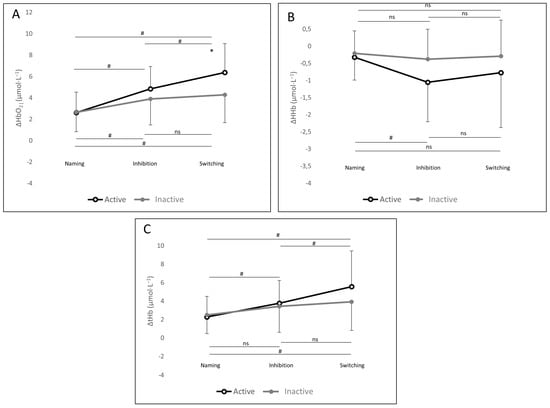 Total cerebral oxygenation (both hemispheres of prefrontal cortex (PFC)) during Computerized Stroop task conditions. (A) Change in total oxyhemoglobin (ΔHbO2), (B) Change in total deoxyhemoglobin (ΔHHb), (C) Change in total total hemoglobin (ΔtHb). Data are presented as means and SDs; *p < 0.05 between active and inactive group. # p < 0.05 between Stroop conditions.