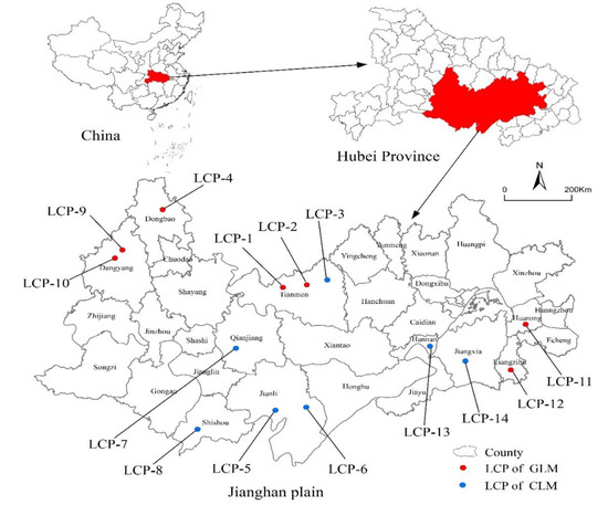 The selection of research objects should meet the following requirements: First, the topographical features, social economy, and agricultural production constraints of the region where the research objects are located must be consistent to ensure the comparability and accuracy of the data. Second, LCP types should include the GLM and CLM. Last, LCPs should be completed in recent 2–3 years so that the LCPs performance is not affected by the dilapidation and damage of projects in the later stage due to the long completion time. Based on the above principles, we chose 14 provincial-level investment projects that were completed in 2016–2017 and located in the hinterland of Jianghan Plain in Hubei Province as our study objects (Figure 1).