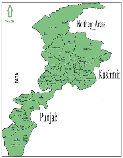 The study was carried out in Khyber Pakhtunkhwa, the northwestern province of Pakistan. The total area of Khyber Pakhtunkhwa province is 74,521 km2 with a census population of 30.52 million according to the census 2017. The land area of the province has 25 districts of different sizes as shown in Figure 1. However, very recently in the year 2019, seven Federally Administered Tribal Areas (FATA) have been merged politically and administratively into the province of Khyber Pakhtunkhwa. The climate in this province is of the tropical monsoon type, but most of the districts are situated beyond the tropical zone with relatively high temperatures and a cool, dry winter that runs from December to February with March to June representing the hot and dry season. Summer extends from July to September and is generally rainy. October and November represent the receding monsoon period. The province has two rainy seasons: March to April and the summer monsoon from July to September.