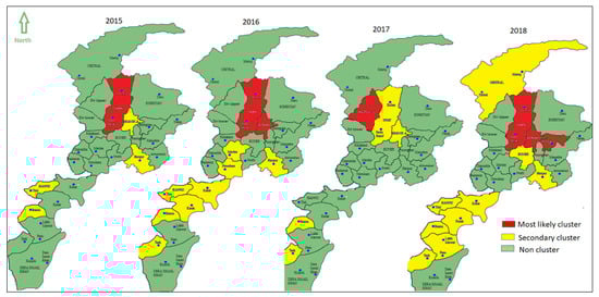 The geographical locations of the significant spatial clusters in each year were displayed in Figure 3. In 2015, the most likely cluster was seen in district Swat. In 2016, the same district with one neighboring district (Buner) appeared as the most likely cluster. In 2017, the most spatial cluster was moved from (Swat Buner) to the neighboring district Upper Dir in the west. The most likely cluster was moved back to districts Swat covering additional neighboring districts (Shangla and Battagram) in the South. The two districts (Swat and Buner) were found repeatedly in the potential cluster each year. The district Swat was seen in the most likely cluster in the year 2015, 2016, and 2018 showing it to be the main region of TB outbreak. Moreover, the two western districts Bannu and Hangu were found to be the spatial clusters throughout the study period (2016–2018). These results suggest three district Swat, Shangla, and Battagram for policymakers to be the most targeted districts for possible interventions because this part of the province was seen in the most likely cluster in each year (2016–2018). The two districts Bannu and Hangu are suggested to be the second targeted districts for possible interventions. These two secondary clusters show a tendency of spread toward the central districts in 2018. The TB case burden in the two western districts (Bannu and Hangu) might be due to the presence of the large proportion of Afghan refugees in these districts as evidence from the previous study [45]. Some previous studies on TB prevalence in the individual district have also been identified the evidence of TB outbreak in our resulted most likely cluster regions Swat and Buner [11,12].