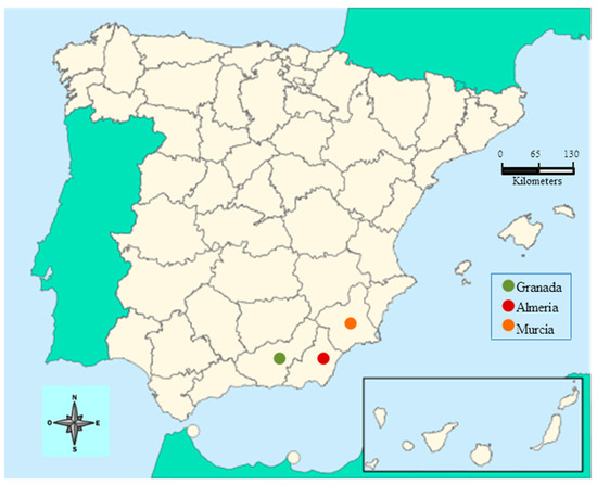 This study is focused on the Spanish agri-food sector, specifically in the southeast region (provinces of Almeria, Granada and Murcia), due to the increase of production in this area and the adaptation process of ecological practices required in consumer markets in recent decades [30]. In this case, agricultural activity has a strong impact on the environment because it involves intensive use of resources, requires intensive transport and generates a considerable amount of waste [101]. These negative externalities have implied a constant adoption of innovations and eco-efficiency methods of production and commercialization in the sector’s firms [93]. Moreover, Spain is the first exporter of fresh fruits and vegetables in the European Union and one of the three largest world exporters, together with the U.S. and China [102]. In terms of figures, Spanish exportation of these products reached 13.8 million tons in 2017, earning nearly 15 billion EUR [103]. In this context, the Spanish provinces of Almeria, Granada and Murcia contribute to these figures by more than 50 percent [95,104]. Figure 1 shows the location of this Spanish region.