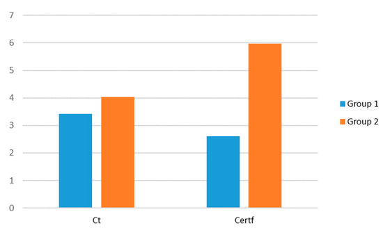 Average scores for Groups 1 and 2 in eco-innovations quantitative variables measured in number scale. Notes: Ct = Environmentally-oriented culture; Certf = Quality certifications.
