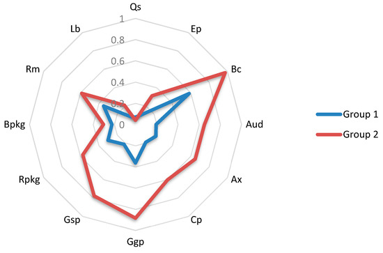 Average scores for Groups 1 and 2 in eco-innovations quantitative variables measured in percentage scale and qualitative variables. Note: Ep = Ecological/integrated production; Bc = Biological control; Rm = Recycled/reused materials; Ct = Environmentally-oriented culture; Qs = Quality staff; Lb = Analysis laboratory; Aud = Environmental audit; Ax = Environmental consulting; Cp = Stakeholders cooperation; Certf = Quality certifications; Ggp = GLOBALG.A.P. certification; Gsp = GRASP certification; Rpkg = Recycled packaging; Bpkg = Biodegradable packaging.