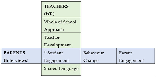 As shown in Table 2, the parents in the program highlighted student engagement, behaviour change, and parent engagement as major outcomes of the program. Unsurprisingly, given the relatedness and social nature of the school environment and concerted efforts in program design to encourage student led health literacy development (competence) developed in a manner that encourages student autonomy, students were highly engaged. HealthLit4Kids places a high priority on student engagement, through health literacy development and artefact creation and sharing. It should be highlighted that this was recognized independently by both the parents and participating teachers at each school. As shown in Figure 1, the parent perceptions of student engagement highlighted in this study are reinforced by the findings from 84 teachers’ written reflections (WR) during the HealthLit4Kids program [49]. In addition, the teachers recognized the importance of the whole-of-school approach (relatedness), reported their own personal and professional development (competence), witnessed high levels of student engagement (competence, autonomy) and described a new shared language being used in the classroom and playground (competence, autonomy, relatedness).