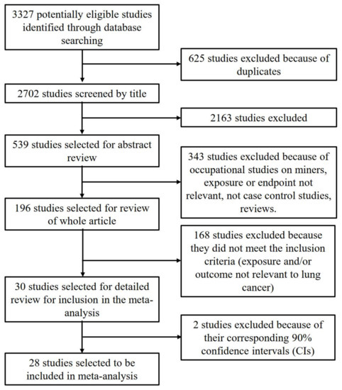 The primary outcomes of the meta-analysis were the ORs, EORs and their corresponding 95% CIs for lung cancer in patients with the highest radon exposure compared with the non/lowest radon-exposed population. Study-specific ORs, EORs and corresponding 95% CIs for highest versus non/lowest radon exposure levels were extracted; and log ORs and log EORs were then weighted by the inverse of their variances to obtain a pooled OR, EOR and their 95% CIs. Initially, all studies were pooled together, and a sensitivity analysis was performed to assess the influences of the methodological concerns by grouping them into different subgroups, including histological subtype, study population, study design, smoking status, sex and duration of radon measurements. In addition, we performed dose‒response analyses of radon on lung cancer and its histological types. Q tests and I2 statistics were used to evaluate the statistical heterogeneity among studies. We used fixed effects models in the absence of significant heterogeneity on the Q tests (p > 0.1) and I2 statistic value ≤50%; otherwise, we used random effects models. A funnel plot and Begg’s test were applied to assess potential publication bias [27,28]. We used Stata (version 13.0; StataCorp, College Station, TX, USA) to analyse the data, and the level of significance was considered at 5%.