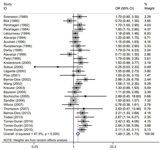 The multivariable adjusted ORs of lung cancer for the highest and non/lowest residential radon exposures are shown in Figure 2 and Table 2. A random effects model was used to calculate the pooled estimated OR because substantial heterogeneity was found across these studies (I2 = 67.5%, p-heterogeneity = 0.000). The pooled OR indicated a statistically significant association between the highest residential radon exposure and an increased risk of lung cancer (OR = 1.48, 95% CI = 1.26–1.73).