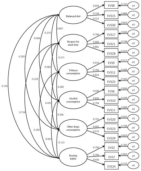 Confirmatory factor analysis showed that the 24 items were grouped into six factors, respectively: balanced diet (5 items), respect for mealtimes (5 items), tobacco consumption (4 items), alcohol consumption (3 items), consumption of other drugs (4 items) and resting habits (3 items). With these results, the structural model reveals a satisfactory overall fit, having models with satisfactory adjustment in previous versions, although with smaller number of analysis dimensions than the EVS II.