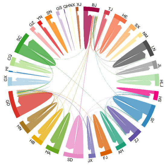 Overall migration patterns of provincial population flows. The main flow of MSM was predominantly located within the province as internal flow. Abbreviations: BJ, Beijing; TJ, Tianjing; HE, Hebei province; SX, Shanxi province; NM, Inner Mongoria; LN, Liaoning province; JL, Jilin province; HLJ, Heilongjiang province; SH, Shanghai; JS, Jiangsu province; ZJ, Zhejiang province; AH, Anhui province; FJ, Fujian province; JX, Jiangxi province; SD, Shangdong province; HA, Henan province; HB, Hubei province; HN, Hunan province; GD, Guangdong province; GX, Guangxi province; HI, Hainan province; CQ, Chongqing; SC, Sichuang province; GZ, Guizhou province; YN, Yunnan province; XZ, Tibet; SN, Shaanxi province; GS, Gansu province; QH, Qinghai province; NX, Ningxia; XJ, Xinjiang.