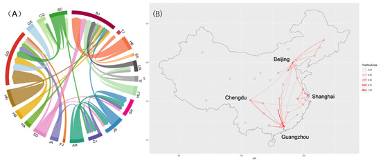 The migration patterns of MSM with an inter-provincial population flow above 2000. (A) Chord diagram. (B) Geographical distribution.