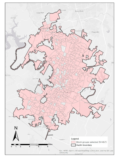 Census block groups were used as a spatial unit of analysis for this study. Austin has a total of 506 block groups, and this study used 457 block groups after excluding 49 samples. The excluded block groups had median incomes less than $10,000, suggesting that a small number of residents live in the communities or that the block groups are heavily commercial areas. Figure 1 shows the study area and 457 block groups used in this study.