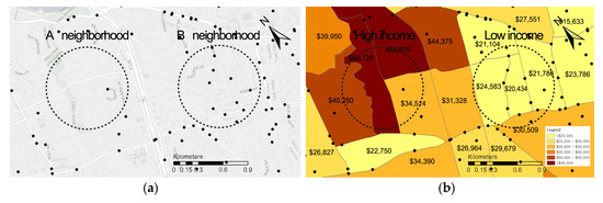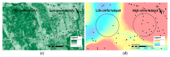 Crime hotspots were analyzed in terms of greenery and income levels between two selected neighborhoods, A and B. The dashed circles representing neighborhoods A and B in Figure 2 have radiuses of 500 meters. These neighborhoods have different levels of median income, environmental conditions in terms of green density, and crime hotspots. Neighborhood A has relatively high income, higher green density, and lower crime hotspots, whereas Neighborhood B has low income, lower green density, and higher crime hotspots.