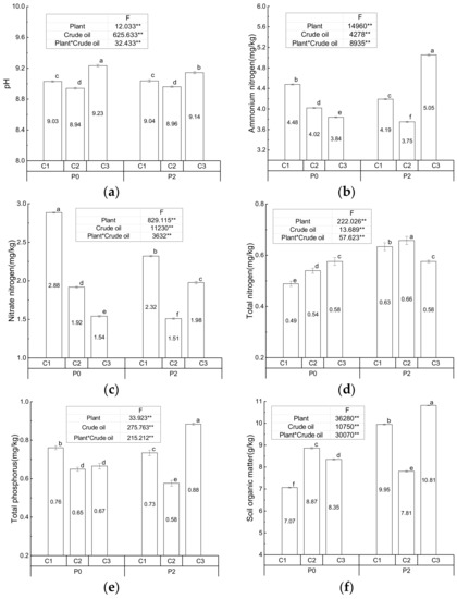 Air-dried soil samples (10 g) were placed in 50 mL centrifuge tubes. Then, 30 mL of chloroform was added to each tube and sealed with a lid. The samples were first placed on a shaker for 5 min and subsequently left undisturbed overnight. The next day, hot dip ultrasonic extraction was performed for 1 h in a 55 °C water bath using an ultrasound bath (KQ-600E, Kunshan Company, Kunshan, China). Then, the samples were centrifuged (Sigma 8k, Sigma, Osterode am Harz, Germany) at 4500 r/min for 5 min, and the supernatants were collected by filtration. Hot dip ultrasonic extraction was repeated twice, and the collected samples were dried over anhydrous sodium sulfate, and then dried by cooling. Depending on the oil and gas industry standards [20], chromatographic techniques were used to separate alkanes, aromatic hydrocarbons, and polar substances in the crude oil. The inner diameter and length of the glass chromatography column (C 7 × 400, Beijing Glass Instrument Company, Beijing, China) are 7 mm and 400 mm, respectively. Silica and alumina were used as the solid phase. Silica gel (particle size: 0.177 mm) was extracted with chloroform until there was no fluorescence, and activated in an electrothermal drying oven at 140–150 °C for 8 h; neutral alumina (particle size: 0.149 mm) was activated for 4 h at 400–450 °C. After activation, they were transferred to a desiccator for cooling and placed in a grinding bottle, and then stored in the desiccator. The silica–alumina column was continuously eluted with n-hexane, and the extracted crude oil was passed through a column in which the polar substance was adsorbed by alumina. The column was repeatedly eluted with 30 mL volumes of n-hexane, and then the selected alkane component was collected. After that, the column was eluted with 30 mL of a mixture of dichloromethane and n-hexane (65:35 by volume) to collect the aromatic component. Finally, the column was repeatedly eluted with 30 mL volumes of chloroform and the polar component was collected, which was dried over anhydrous sodium sulfate, and dried by cooling. The total amount of petroleum pollutants and the composition of each family were determined by a weighing method described elsewhere [20]. The pH, ammonium nitrogen (NH4-N), nitrate nitrogen (NO3-N), total nitrogen (TN), total phosphorus (TP), and soil organic matter (SOM) in the soil were evaluated with reference to Soil Agrochemical Analysis (third Edition) [42]. Soil NH4–N and NO3–N were extracted with 100 mL of a 1 mol L−1 KCl solution, shaken in a rotary shaker (140 r min−1) for 1 h, and filtered into sampling bottles. Samples were stored frozen until their analysis with a colorimetric continuous flow analyzer (SANT++, Skalar Company, Breda, Netherlands). The SOM was determined by the potassium dichromate titrimetric method using an electric balance (FA-N, Jingqi Company, Shanghai, China). The TN was determined by Kjeldahl digestion using a Kjeldahl analyzer (KjelFlexK-360, Buchi, Flawil, Switzerland). The TP was determined by the molybdenum blue method using a UV-vis spectrophotometer (DB-20R, HALO, Sydney, Australia).