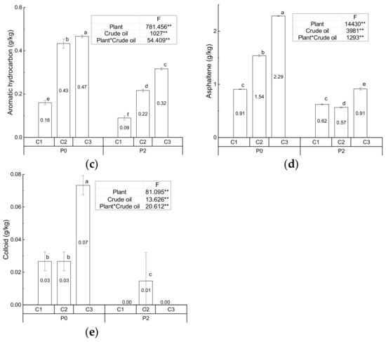 The crude oil (a), saturated hydrocarbon (b), aromatic hydrocarbon (c), asphaltene (d) and colloid (e) in controls and treatments. (** indicates the significant difference at the 0.01 level, and average values are in the center of column (calculated from three replicates), meanwhile the error bar of the column is the value of standard deviation. Columns noted by the same and different small letter means insignificant and significant difference at the 0.05 level, respectively. Colloid data in the low and high contamination with S. salsa are below the detection limit.).