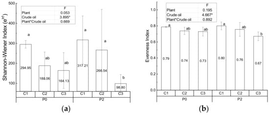 The Exponential Shannon-Wiener index and Evenness index of control and treatment groups are presented in Figure 3. Good’s coverage is higher than 98%. No significant difference of Simpson’s Reciprocal index among controls and treatment groups (P0C1: 78.16 ± 10.94; P0C2: 57.51 ± 21.10; P0C3: 58.18 ± 32.51; P2C1: 103.98 ± 89.11; P2C2: 97.97 ± 105.08; P2C3: 29.86 ± 15.56) are found by F test. The F values of plant, crude oil and interaction of plant with crude oil are 0.222, 1.815 and 0.665, respectively, but their p values are all higher than 0.05. Crude oil significantly influences the Exponential Shannon-Wiener index and Evenness index, while the effect of S. salsa and its interaction with crude oil are not prominent. In the treatment groups with S. salsa, the difference in the Exponential Shannon-Wiener index in the low and medium contamination group is not significant; the Exponential Shannon-Wiener indexes of both are however significantly higher than that of the high contamination group. In addition, the Evenness index of the low contamination group with S. salsa is significantly higher than that of the high contamination one. It has been shown that the bacterial diversity in soil is remarkably reduced by oil contamination, regardless of the soil matrix type [53]. Similar results i.e., a decline in the overall microbial diversity owing to contamination has been documented in the literature [54,55]. Therefore, the impact of high crude oil contamination on the bacterial diversity is greater than the effect of plant [56], which may be used to explain the decline in the bacterial diversity in the high contamination treatment group.