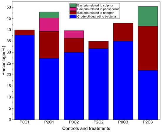 Bacteria performing certain functions in the control and treatment groups (Figure 4) were inferred by the results from literature [44,64]. The largest percentage of the bacteria in the experimental group was the crude oil degradation bacteria, which was found at 37.67, 27.33, 30.00, 31.67, 35.00, and 22.00% in the low, medium, and high contamination control and treatment groups, respectively. Compared with those in the low crude oil contamination control group, S. salsa decreased the percentage of crude oil degradation bacteria, while increasing the percentage of sulfur, phosphorus, and nitrogen-related bacteria. Meanwhile, opposite and similar results were found in the medium and high treatment groups, respectively. The P cycling bacteria were not found in the medium and high contamination group with S. salsa, which indicated their strong inhibition by the medium and high crude oil contamination. S cycling bacteria were absent in control groups, but were found in the high contamination group with S. salsa (8.67%) at a higher abundance than that in the low contamination treatment group. This result possibly indicates that this metabolism is related to the S composition of the crude oil. However, the opposite result was obtained for the medium contamination group with S. salsa. Meanwhile, P cycling bacteria were only found in the low contamination group with S. salsa (6.00%) and the medium contamination control group (3.33%). This may be due to the uncertainty of bacterial function owing to the limited literature.