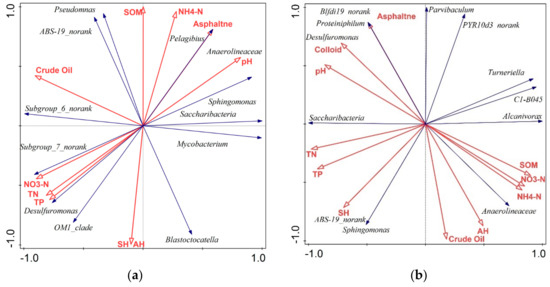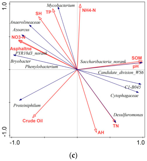 Bacterial variables are explained by the eigenvalues (horizontal axis), with percentages of 84.2%, 81.8%, and 93.5% in three treatment groups with S. salsa, which indicated the good ranking results. In the low crude oil-contaminated soil with S. salsa, Anaerolineaceae_uncultured (9.33%) belonging to the crude oil degradation bacteria has a negative relationship with the crude oil and saturated/aromatic hydrocarbon. In addition, no significant correlation of other crude oil degradation bacteria with the environmental factors was found. Saccharibacteria belonging to bacteria related to N cycle has a positive correlation with pH, asphaltene, NH4-N and SOM, and Pseudomonas belonging to bacteria with P cycle is positively related to SOM, NH4-N, asphaltene, pH, and crude oil. All these correlations are not significant. However, the correlation of Anaerolineaceae and Pelagibius with asphaltene, Subgroup_7 with NO3-N, is significant. Desulfuromonas belonging to bacteria related to S cycle has a significant positive correlation with TN and TP, while having a negative correlation with pH. In the medium crude oil-contaminated soil with S. salsa, most bacteria belonging to crude oil degradation are negatively correlated to crude oil concentration except for Anaerolineaceae_uncultured (7%). C1-B045 (2.33%) and Turneriella (2.33%) both have significant and negative correlations with TN and TP. The correlation of Anaerolineaceae_uncultured (7%) with colloid, and correlation of Parvibaculum (2.0%) with crude oil are both significant and negative. Meanwhile, Proteiniphilum (1.67%) has a significant negative correlation with aromatic hydrocarbons and a significant positive correlation with asphaltene. Saccharibacteria (3.33%) of N cycling bacteria has a positive correlation with TN and TP, and a negative correlation with NH4-N and NO3-N, both of which are not significant. In the high crude oil-contaminated soil with S. salsa, Desulfuromonas (8.67%) related to the S cycle showed a remarkable and negative correlation with saturated hydrocarbons, and significant and positive correlation with TN. Meanwhile, Azoarcus (2.67%) related to the N cycle showed a significant positive correlation with NO3-NThe correlation of the crude oil degradation bacteria with crude oil/oil components and nitrogen is mostly significant and negative, indicating the significant effect of crude oil on the related degradation bacteria. A similar effect was also observed in other studies [56,57]. Meanwhile, both negative correlations were caused by crude oil in Shengli Oilfield with a high nitrogen content. However, a clear difference was found in previous studies, which showed that pH is an important driver of bacterial community [65,66]. Significant correlation of bacteria related to the N cycle with different nitrogen species was found among the three treatment groups. Furthermore, the positive or negative correlation was caused by different nitrogen transformations [67,68,69]. Significant and positive correlation of P cycling bacteria with crude oil and nitrogen species was found only in the low contamination treatment group. In addition, significant correlation of S cycling bacteria with crude oil components was found in the medium and high treatment groups. This result might be closely associated with the phosphorus content [67] and S. salsa [70]. Most crude oil degradation bacteria are negatively related to crude oil content. While, the relationship of other bacteria with crude oil or physio-chemical properties varies greatly depending on different parameters. N cycling bacteria were sensitive to TN, TP, ammonia nitrogen, nitrate nitrogen, and pH.