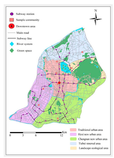 Nanjing is an important central city in the east of China. In 2018, the resident population was 8.46 million, and the urbanization rate was 82.5%. However, Nanjing’s excess commuting index reached about 0.55, the average one-way commuting distance reached 8.9 km, and the average one-way commuting time reached 42.3 min; there was a relatively serious imbalance between occupation and residence, which ranks medium among major cities in China [46]. This study takes the traditional main city of Nanjing as the sample collection area for the survey of commuting activities (Figure 1). This area has the most concentrated population, the most complex and diverse urban space, and the most frequent commuting problems. Therefore, this case study in Nanjing is typical and complete.