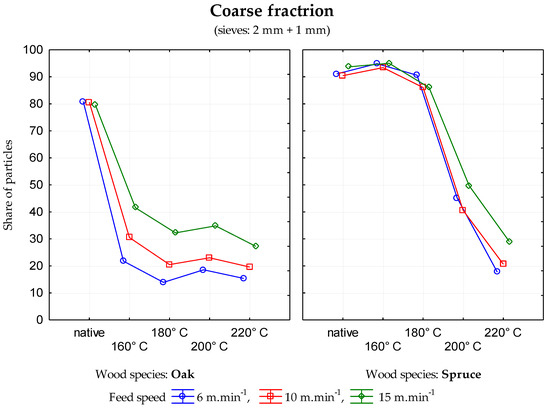 Percentage of particles in the mesh size of 2 mm and 1 mm—coarse fraction depending upon the temperature modification of oak and spruce.