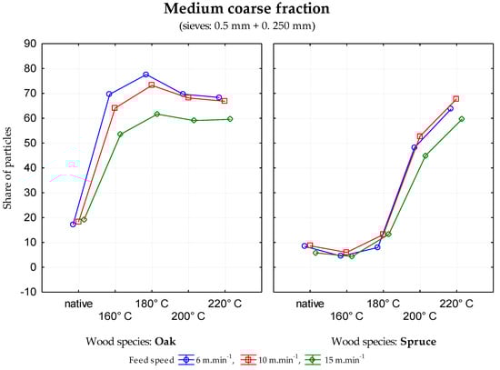 Percentage of particles in the mesh size of 0.5 mm and 0.250 mm—medium coarse fraction depending upon the temperature modification of oak and spruce.
