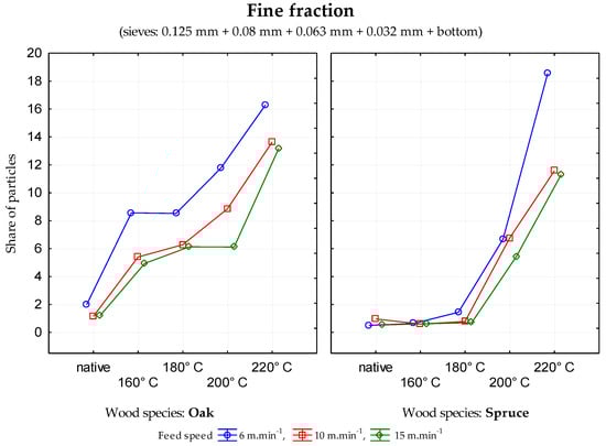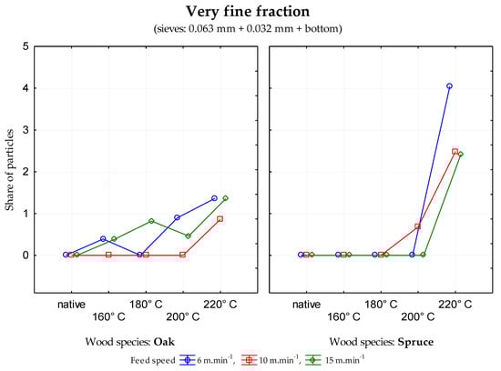 In terms of safety and health risk, the very fine fraction (Figure 4), (i.e., elements with the size ≤0.08 mm) are considered the most harmful. The generation of very fine particles did not occur during the process of milling the native wood (or their values were very low). In the case of oak wood, it was from 0.23% to 0.40%. In the case of spruce wood and the temperatures of modification of 160 and 180 °C, these particles were not observed either. However when the temperature was further increased, sawdust occurred. In the case of oak and spruce, the highest values 4.3% were at a modification temperature of 220 °C and feed rate of 6 m·min−1. In the case of spruce wood, the value was 8.07%. This represents the percent fraction that can result in health and safety risk in the workplaces specialized in woodworking operations [43]. The aforementioned effect is even more significant when using profile knives with higher number of cutting edges.