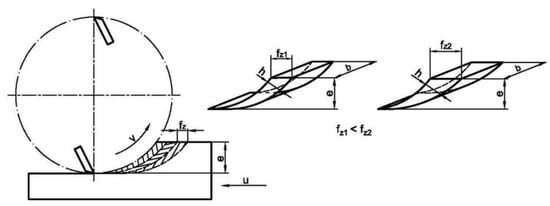 Particles resulting from milling, its different thickness when the feed per tooth is different fz. (h—nominal thickness of removed layer, e—depth of cut, b—thickness of sample).