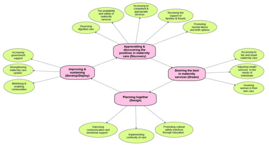 We applied the four-stepped processes of AI to elicit examples of positive care interactions and envisage what best quality maternity care might look like in the future [29]. AI is open-ended, allowing a flexible approach to be taken depending on the needs of the participants [30]. The collaborative nature of AI is helpful in the development of confidence and can motivate participants to become actively involved in change [31]. We designed this research not only to identify the changes that are needed to improve maternity care but encourage women to become involved in this change as users and beneficiaries of maternity services.