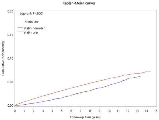 The Kaplan–Meier method was used to estimate cumulative incidence of new onset sarcopenia during the follow-up period. The cumulative incidence of new onset sarcopenia during the follow-up period for the group that was using statins was lower than that for the group that was not using statins (Figure 1). Additionally, in terms of the follow-up period, the cumulative incidence rate of new onset sarcopenia for the group that was using statins gradually approached the cumulative incidence rate for the group that was not using statins, with significant difference (p < 0.0001) using the log-rank test.
